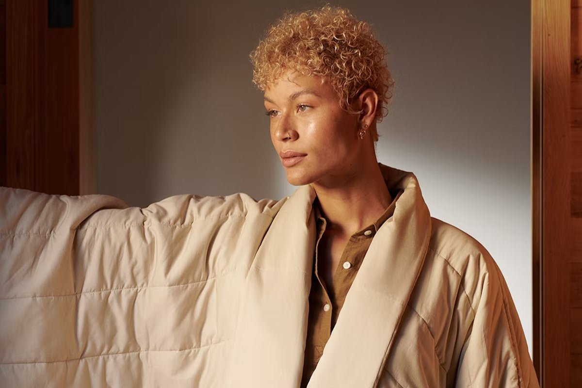 You might have to leave bed. but your bed doesn’t have to leave you. Wrap up in our puffy. duvet-like Blanket Robe. and wear the comfort of bedtime all day long.