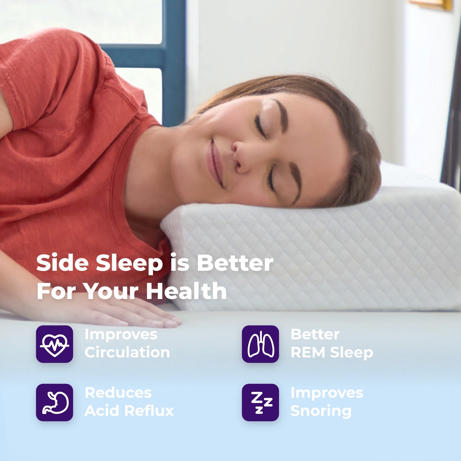 The Side Cube was designed by side sleepers. for side sleepers. to provide optimal comfort and support for a better night’s sleep. Its unique shape promotes proper neck and spine alignment and helps you wake up feeling refreshed. energized. and ready to take on the day!